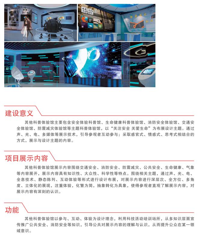 其 他 科 普 体 验 馆 主 要 包 含 安 全 体 验 科 普 馆、生 命 健 康 科 普 体 验 馆、 消 防 安 全 体 验 馆、 交 通 安全 体 验 馆、 防 震 减 灾 体 验 馆 等 主 题 科 普 体 验 馆,以“ 关 注 安 全 关 爱 生 命 ”为 布 展 设 计 主 题 。通 过 声 、光、 电、 多 媒 体 等 展 示 技 术, 引 导 参 观 者 互 动 参与;采 取 感 官 式 、情 感 式 、思 考 式 相 结 合 的 方 式 ,展示与设计主题的内容。