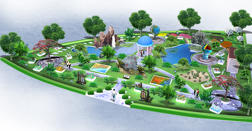 校园景观环境主要包括:植物造景绿化(花草树木等)、景观路网、地理园、水体景观、主题雕塑、文化墙等。