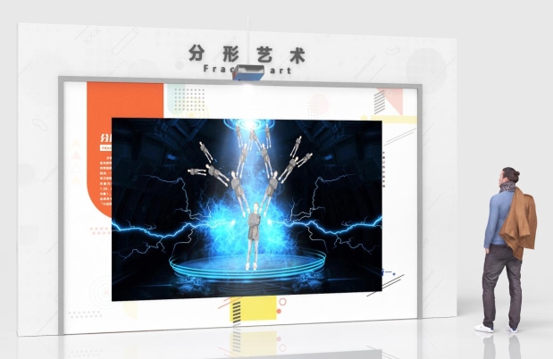 展项主要由投影、体感捕捉处理系统、造型等组成。体感捕捉处理系统通过体感摄像头捕捉动作后, 经过计算机处理,投影画面显示出相应的分形几何图形,体验者直观了解分形的典型特征,并通过分形图形(大自然的分形几何学、磁混沌摆等), 将观众引入非线性的科学世界。