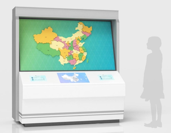 展品由柜体、中国地图、互动屏、灯箱等组成。屏幕中的中国地图与灯箱地图默认情况下均为黑白色,通过互动屏进行填色游戏,每次选择四种颜色中的一种依次为中国地图着色(相邻区域颜色不能相同),同时墙面地图中不同区域灯箱颜色与屏幕进行互动,通过填色游戏来了解和验证四色定理。