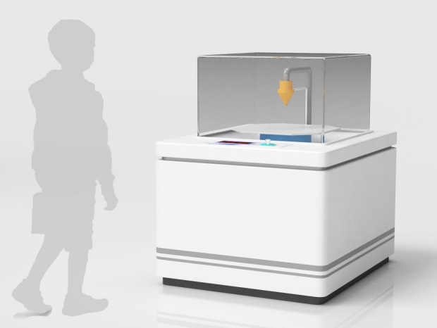 展品由音源振动器,振动板、沙粒回收装置、自动送沙装置、音响电路等组成,当启动电源按钮,送沙装置向振动板上倒沙,同时振动器带动振动板按设定频率和幅度震动,驻波形成波节线模式,沙子聚集在这些线上,很快形成规则的排列图案,通过旋转按钮调节频率,可以看到在不同音调下所形成不同图案。