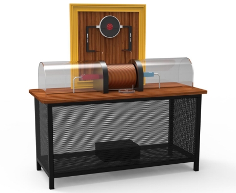 展台下方由一个永磁铁和线圈,上方是一圈小灯,当转动手柄带动磁铁使与小灯连接的线圈切割磁铁是磁场从而使小灯亮起。