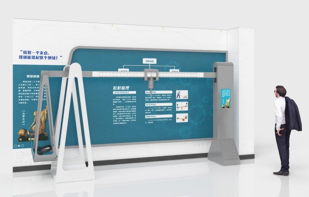展项利用杠杆平衡原理制作了一个大型的杠杆秤,展示了杠杆平衡的原理。展项由结构支撑架、巨型杠杆、固定座椅、磅秤游标等组成一个大型的人体秤,观众可以通过展项测量出体重。展项需要两名体验者合作,一人坐在椅子上,另一人拨动磅秤游标,当杠杆处于平衡状态时,读出游标位置的数值就是被称人的体重,显示屏中输入自己的年龄、身高体重、性别的信息,获取关于当前BMI指数以及生活习惯的建议。