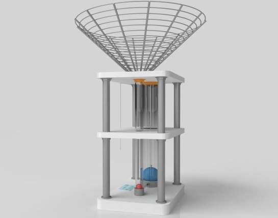 根据理想气体定律公式可得:当温度保持不变时,压强和气体体积成反比,气体体积越小,压强越大。展项中,当我们松开绳子使顶端的圆盘迅速落下时,粗管内的气压瞬间变大,空气被迫压入窄管,推动小球向上运动,小球弹射而上。当小球撞到挡网上后,沿着漏斗型防护网又落回窄管内。