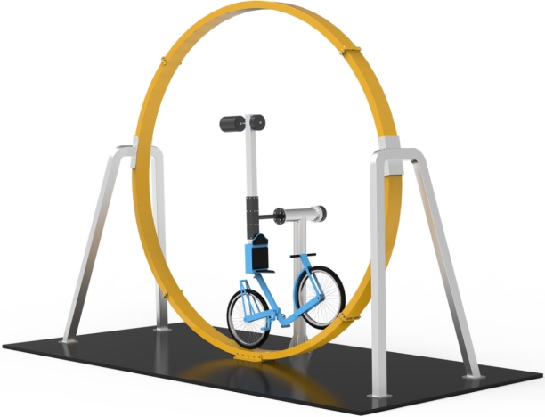 设置特制的机械装置,由自行车与圆形轨道等构成。当自行车骑行的时候,会沿着圆形轨道进行360度运动。了解空中自行车平稳骑行的原理,即:当物体重心下移,物体的稳定度就会提升。