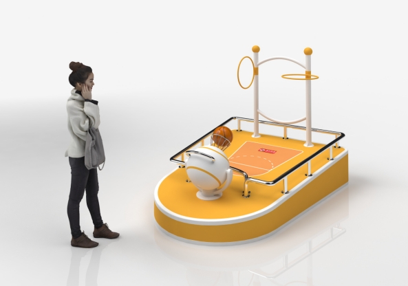展示伯努利原理和地球引力。投篮器喷出的气流遵循伯努利原理,即上喷气流在自由空间受到球体阻挡而向四周自然扩散过程中,气流外围速度变小,而气流中心处的气流速度则较大。按照伯努利原理:气流速度快,气压就低。小球在低压区就被气流“吸住”悬浮在空中,但是受到地球引力的作用,球的自重又将使球掉向地球。所以巧妙掌握好气流压差和球体自重的关系,就可以将球投进篮筐。