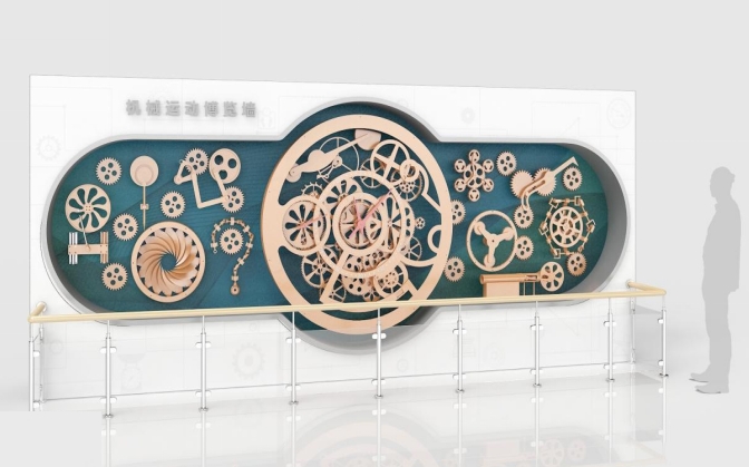 展墙上的所有传动机构均可运动,由背部电机驱动,部分传动机构在展墙背部通过链传动连接,传动平稳,可靠性高。中间的钟表机构可以真实反应时针、分针、秒针的运动关系,并且,时针分针可手动调节时间,指针背后齿轮可以啮合运动,展示钟表内部机芯运动。