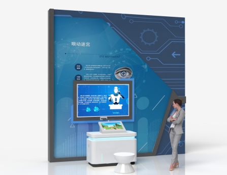展品主要由展台、眼动仪、大屏幕电视机、数显装置、触摸屏等组成。在展台上设有一台触摸屏,参与者坐在座椅上,点击触摸屏选择游戏模式,然后用眼睛注视游戏画面中出现的目标并将其击落,从而实现眼动迷宫。大屏幕会同步显示游戏画面,同时数字显示屏显示游戏成绩。