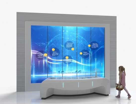展项在展台上设置6套展示不同信息时代的透明屏及对应的实物,观众走到展台相应的位置,展台上的透明屏亮起,开始播放对应的通信技术;桌面设有360°3D炫屏,循环展示不同信息网络时代基站天线的特点。