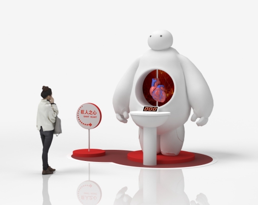 展项为一项互动体验装置,由感应手柄、投影机组成。参与者双手握住手柄,投影中将会显示出心脏跳动的画面,且心脏跳动频率与参与者一致;观看心脏跳动频率有何变化;数秒后心脏影像缩小,演示心脏跳动与血液循环的关系。外围灯带闪烁演示血液循环状态。