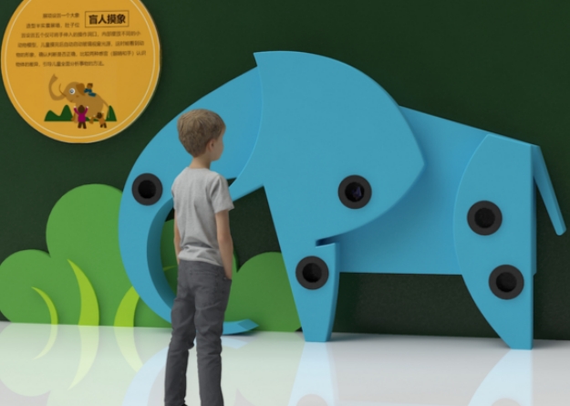 展项设置一个大象造型半实景展墙,肚子位置设置五个仅可将手伸入的操作洞口,内部摆放不同的小动物模型,儿童摸完后自动启动玻璃视窗光源,这时能看到动物的形象,确认判断是否正确,比较两种感官(眼睛和手)认识物体的差异,引导儿童全面分析事物的方法。