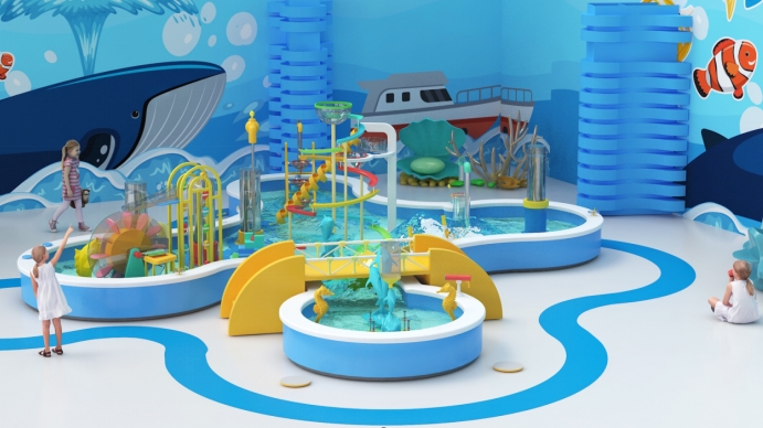 展项设计了一个大型戏水池,利用有限的空间,容纳更多的体验者同时进行互动游戏,兼具了美观性和实用性。