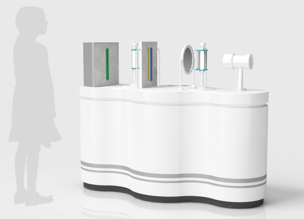 体验者调节三棱镜片的角度,观察白光和单色光经过折射的不同现象。
