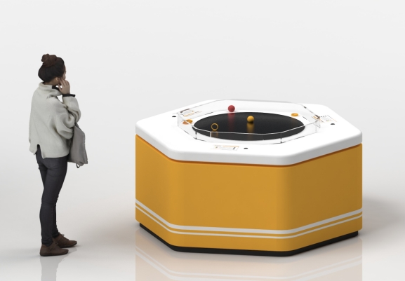 展项通过互动,让观众看到区别于普通惯性力和惯性离心力的科里奥利力。观众按下开关按钮后,展品的旋转台便会不停的旋转起来,当观众把圆环放在旋转台上任一位置时,圆环会开始以相同于那一位置的速率转动,当圆环保持这一速率,通过转动较快的外缘区域时,它会朝旋转台旋转的相反方向偏离。旋转台的旋转会影响在它表面移动的圆环路径,其外缘地方的速度会比靠近中心处的速度来的快,所以观众放在展台不同位置的圆环它们的移动是不一样的。
